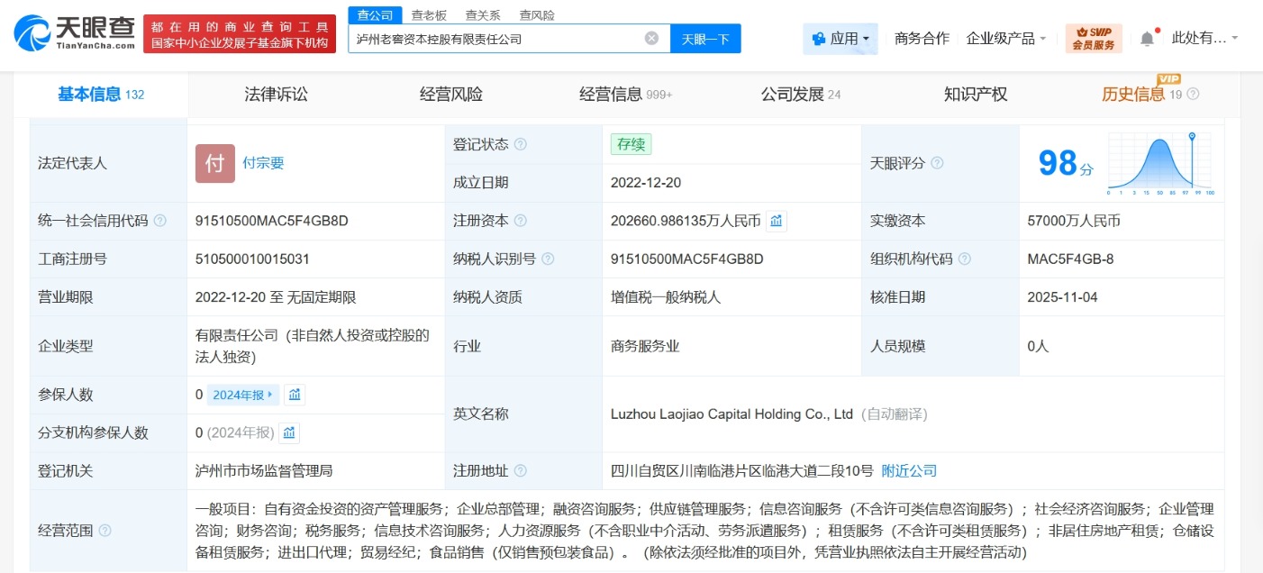天眼查工商信息显示,近日,泸州老窖资本控股有限责任公司发生工商变更,注册资本由约15.3亿人民币增至约20.3亿人民币,增幅约33%,同时,法定代表人及多位主要人员发生变更。该公司成立于2022年12月,法定代表人为付宗要,经营范围含自有资金投资的资产管理服务、企业总部管理、融资咨询服务、供应链管理服务、信息咨询服务、社会经济咨询服务、企业管理咨询、财务咨询等。股东信息显示,该公司由泸州老窖集团有限责任公司全资持股。