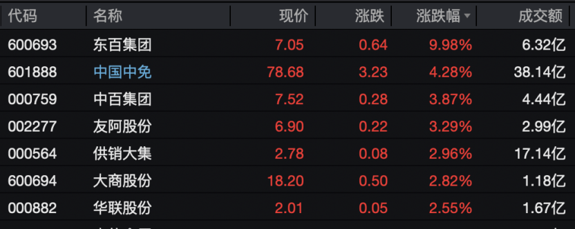商贸零售板块亦表现强势,东百集团涨停,中国中免、中百集团、供销大集等股票跟涨。
