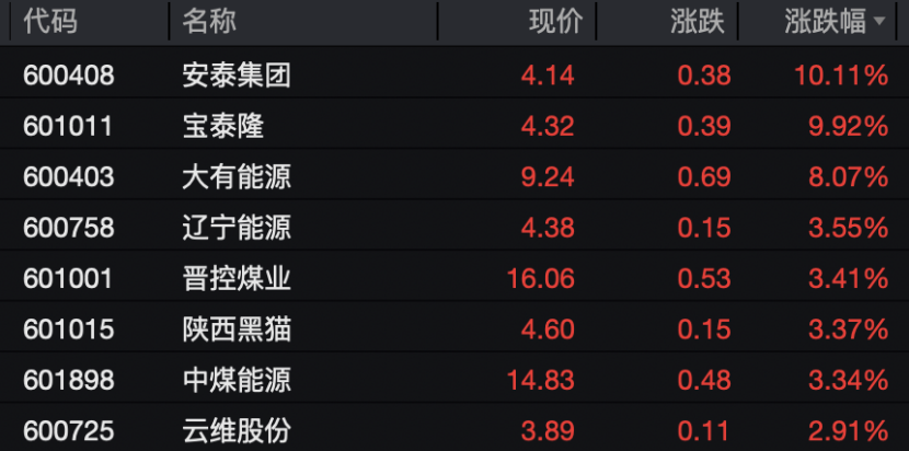 煤炭板块领涨,板块盘中涨幅超过1.5%,安泰集团、宝泰隆涨停,大有能源一度涨停,目前涨幅超过8%。