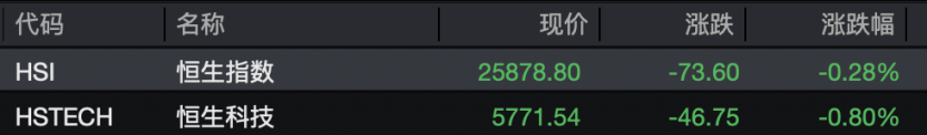 港股方面,恒指、恒生科技指数跌幅较盘初显著收窄。截至午间收盘,恒指跌0.28%,恒生科技指数跌0.8%,盘初分别跌超1.7%、2.8%。