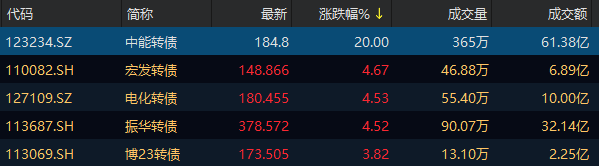 上证报中国证券网讯 11月5日,中证转债指数午盘上涨0.49%,报485.01点。中能转债、宏发转债、电化转债、振华转债涨幅居前,分别涨20.00%、4.67%、4.53%、4.52%。25新华EB、信服转债、中旗转债跌幅居前,分别跌7.50%、2.78%、2.37%。