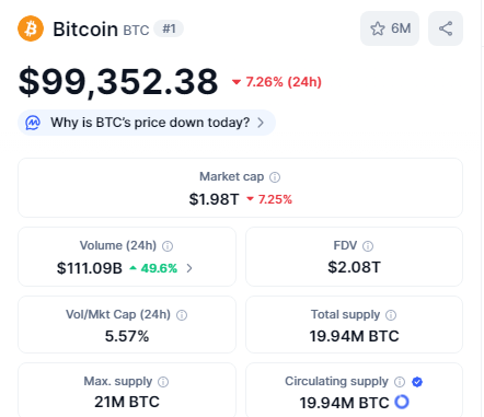 上证报中国证券网讯据CoinMarketCap平台报价,北京时间11月5日9时44分,比特币价格跌破10万美元,报99352.38美元,24小时跌幅超过7%。
