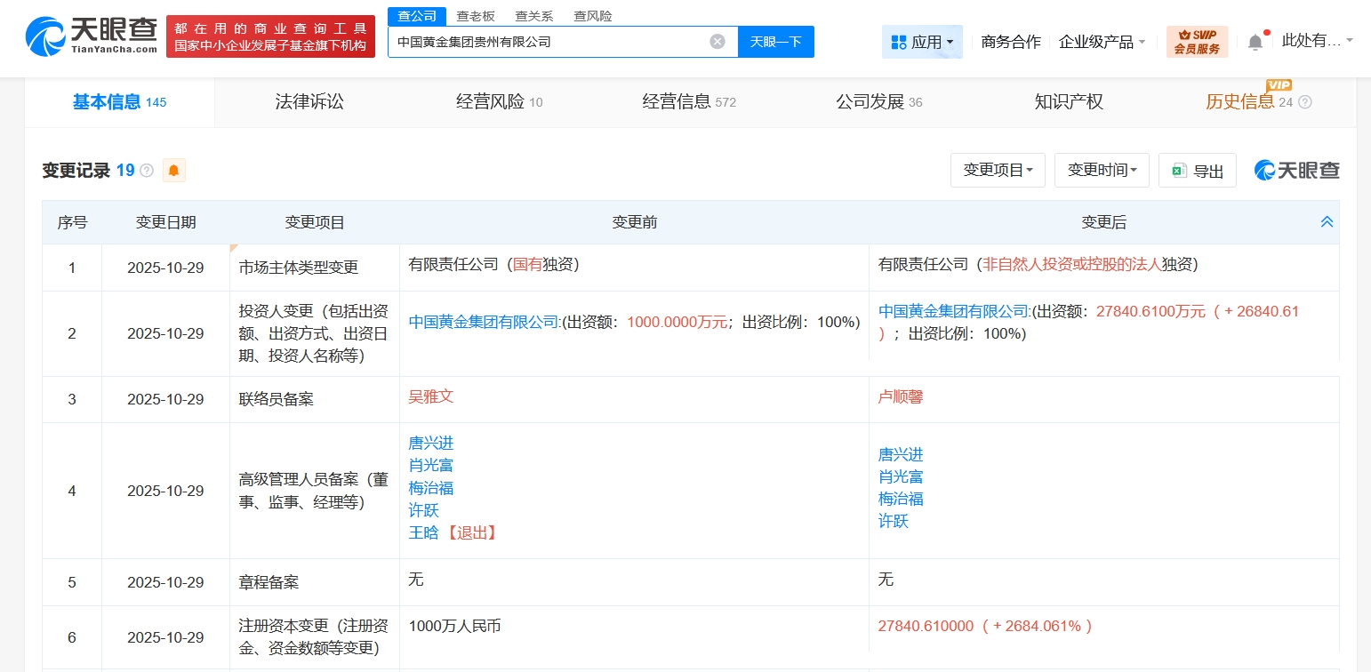 南方财经11月5日电,天眼查工商信息显示,近日,中国黄金集团贵州有限公司发生工商变更,注册资本由1000万人民币增至约2.8亿人民币,增幅约2684%。该公司成立于2005年11月,法定代表人为肖光富,经营范围含水文地质、工程地质、环境地质调查,固体矿产勘查,冶金矿山设备及原材料的销售,普通化工产品、五金交电、劳保用品、锅炉设备、矿山各种耗材的批零兼营等。股东信息显示,该公司由中国黄金集团有限公司全资持股。