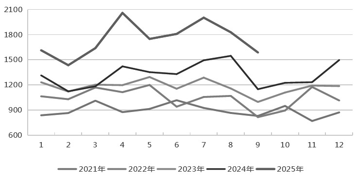 进口端,我国9月铝土矿进口1588万吨,环比下降13.2%,因受几内亚雨季影响,同比增加38.1%;1—9月累计进口15730.5万吨,同比增加近32%,自几内亚进口占比为75%。当前几内亚雨季影响基本结束,铝土矿发运量回升,这将体现在我国11月进口数据上。短期海外矿端没有发生明显干扰事件,进口矿供应整体偏宽松。截至上周末,国内铝土矿港口库存2735.84万吨,较前一周下降35.93万吨。