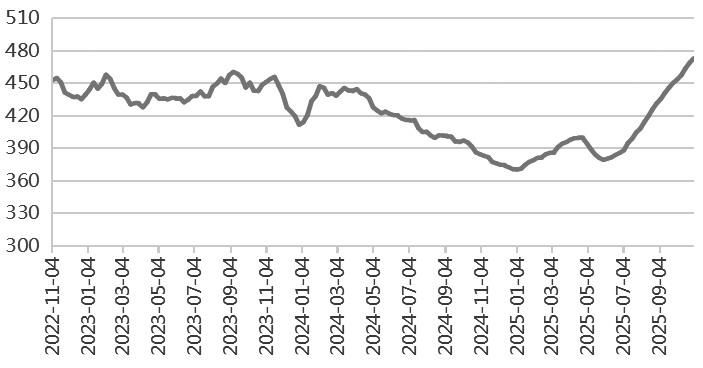 相关数据显示,10月我国冶金级氧化铝产量778.53万吨,环比增长2.4%,同比增长6.8%;1—10月累计产量7445.8万吨,同比增长8.1%;10月日均产量小幅回落,因受北方部分企业例行检修及国产矿供应紧张制约,且南方地区冶炼负荷也有所下滑。7月后国内氧化铝建成产能持稳,近几个月没有新增产能落地。截至上周四,全国冶金级氧化铝建成总产能达11032万吨/年,运行产能9065.7万吨/年,周度开工率环比微降0.24个百分点,至82.18%,广西地区开工率小幅下滑,总体运行产能徘徊在高位。
