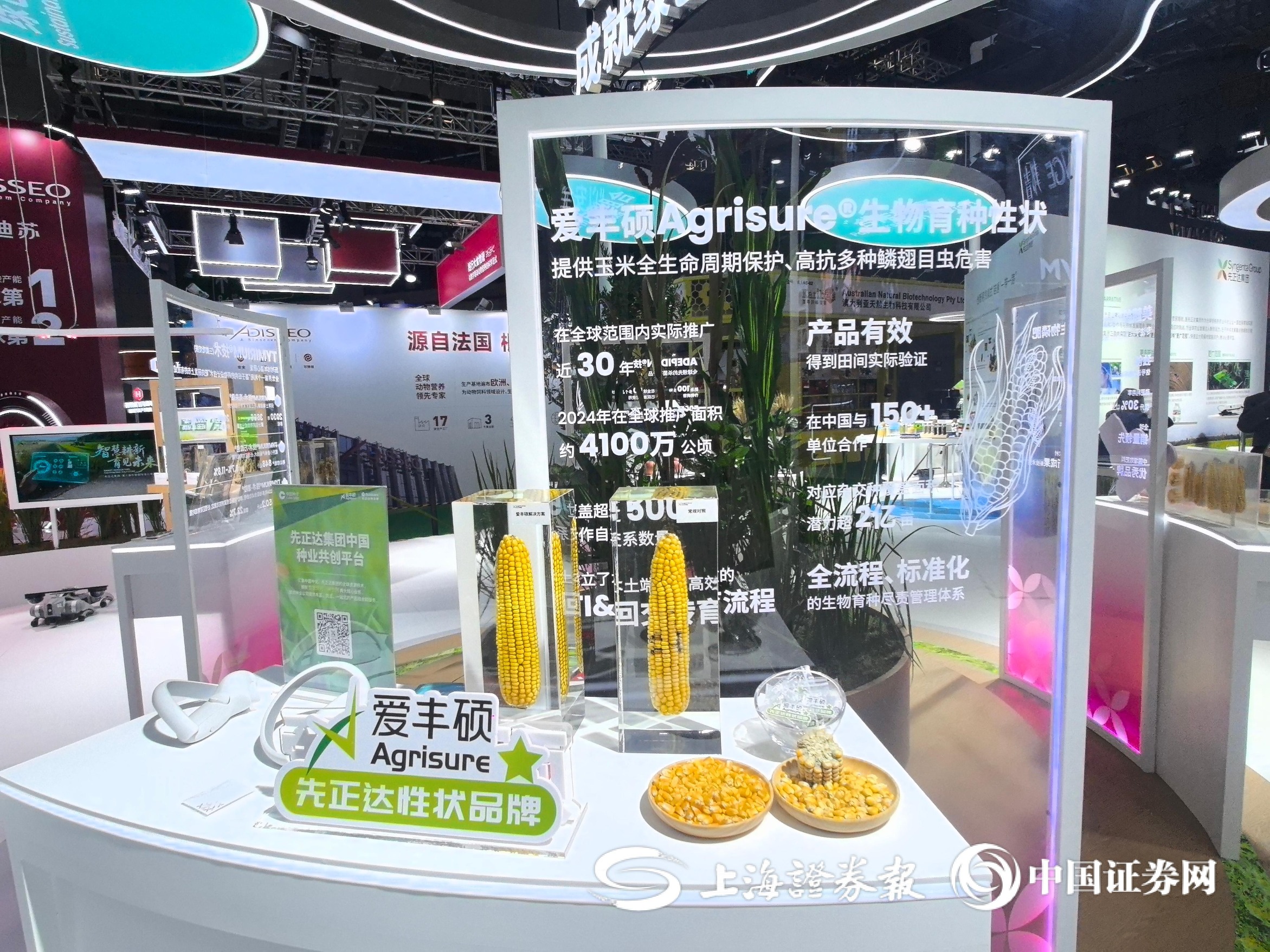 走进先正达集团展台,记者看到,展台中央是一座别具特色的“创新岛”,这里汇聚了四款全球独创、效用显著且影响广泛的突破性技术。三层环形展台中央,一株株水稻、小麦、大豆和玉米在灯光下生机盎然,象征着科技创新从实验室走向田间的蓬勃力量。
