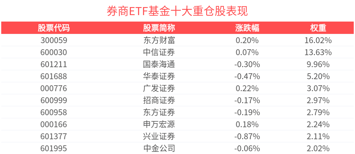 数据显示,截至2025年10月31日,中证全指证券公司指数(399975)前十大权重股分别为东方财富(300059)、中信证券(600030)、国泰海通(601211)、华泰证券(601688)、广发证券(000776)、招商证券(600999)、东方证券(600958)、申万宏源(000166)、兴业证券(601377)、国信证券(002736),前十大权重股合计占比59.88%。