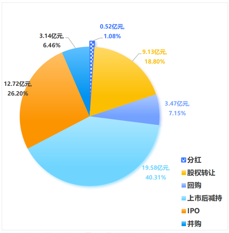 退出方面,102起退出事件中,分红、股权转让、回购仍是主流方式,IPO退出仅7起。即便加上上市后减持,资本市场退出也非主要通道——这与全国市场趋势一致。