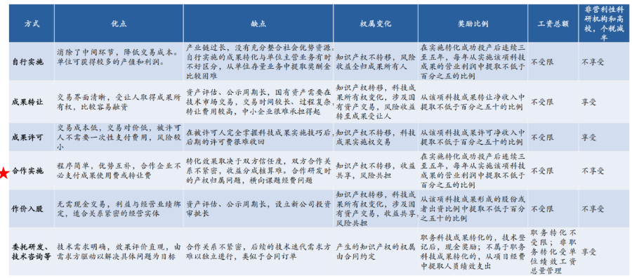 根据《科技成果转化法》,成果转化有六种方式:自行转化、成果转让、许可使用、合作实施、作价入股、技术合同转让。细分来看,可归为两大类:前三种涉及产权交易,后者则是技术服务合作。