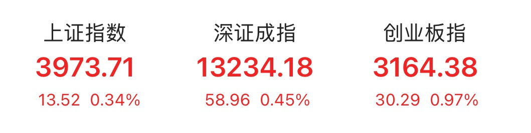 11月5日午后,A股三大指数全线翻红。截至发稿,上证指数涨0.34%报3973.71点,深证成指涨0.45%报13234.18点,创业板指涨0.97%报3164.38点。