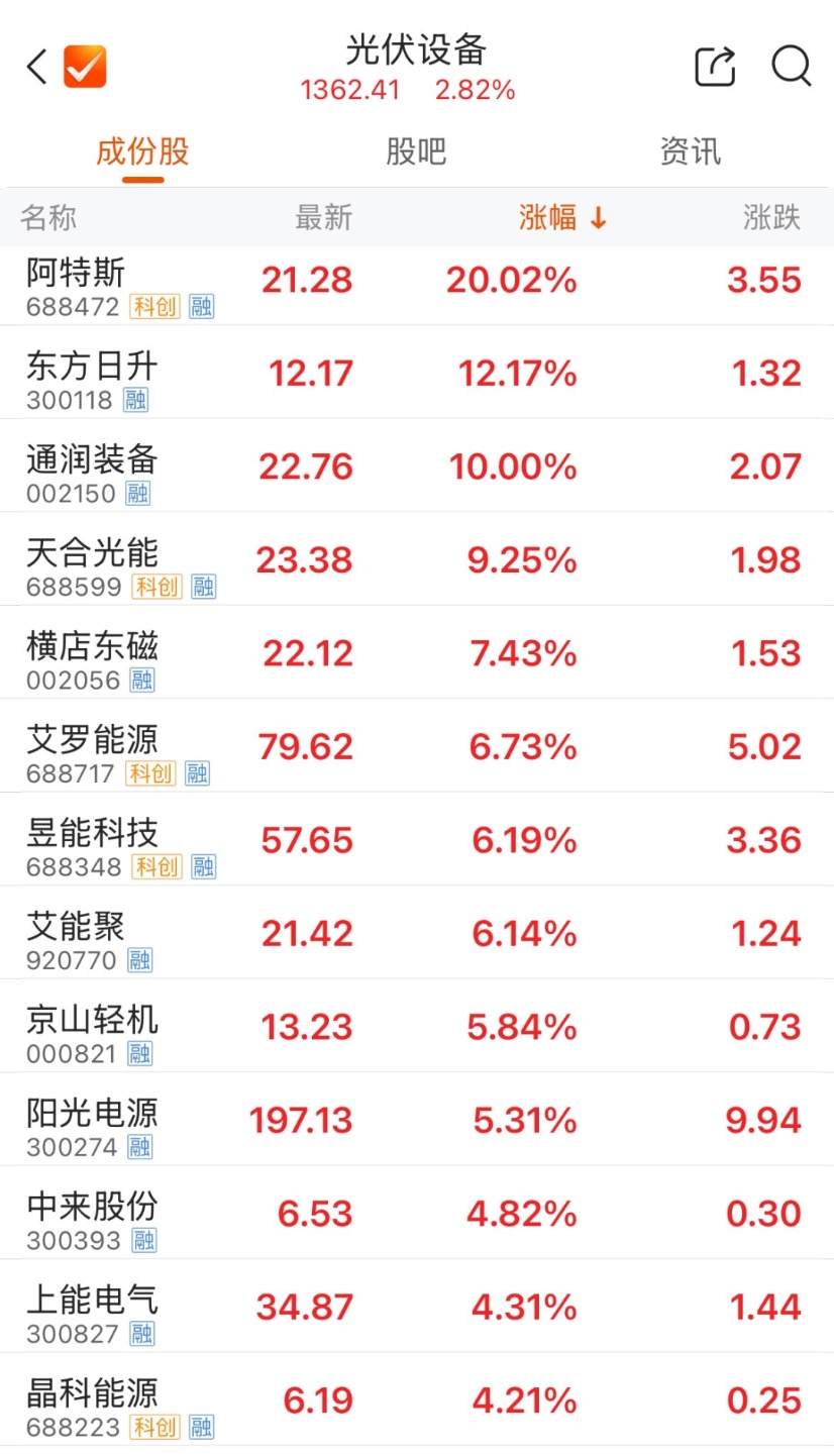 光伏概念股走强,截至发稿,阿特斯(688472)“20cm”涨停,天合光能、阳光电源、晶澳科技等纷纷走高。