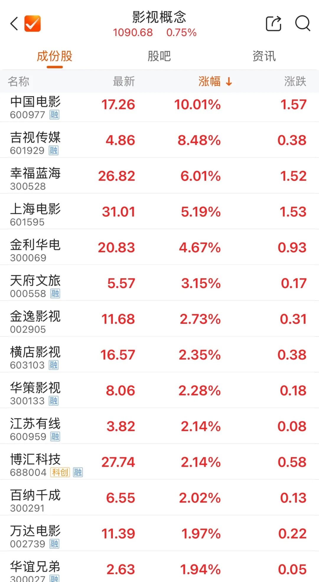 影视股表现活跃,截至发稿,中国电影涨停,幸福蓝海涨超6%,上海电影涨超5%。