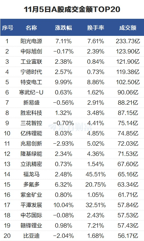 活跃个股:阳光电源成交234亿元 N丰倍换手率77%