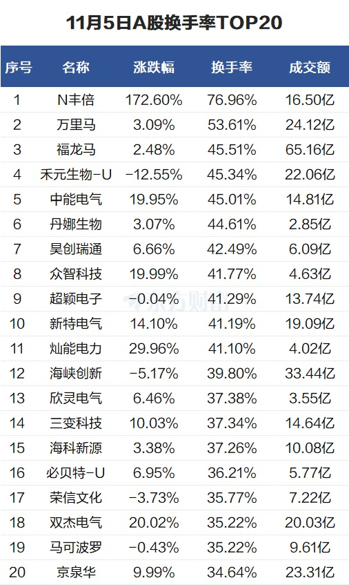 当天换手率最高的个股为N丰倍,全天换手率76.96%。万里马紧随其后,全天换手率53.61%。