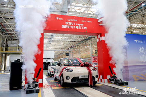 11月5日上午,一台全新车型缓缓驶出广汽埃安长沙智能生态工厂生产线,标志着由零售、制造与能源领域代表企业京东、广汽集团、宁德时代联合推出的“国民好车”——埃安UT super 1号车正式下线。随着埃安UT super陆续下线,车辆预售、试驾也于当天全面启动。目前,在京东搜索“国民好车”已可预约订购,该车型将于11月9日正式发布。