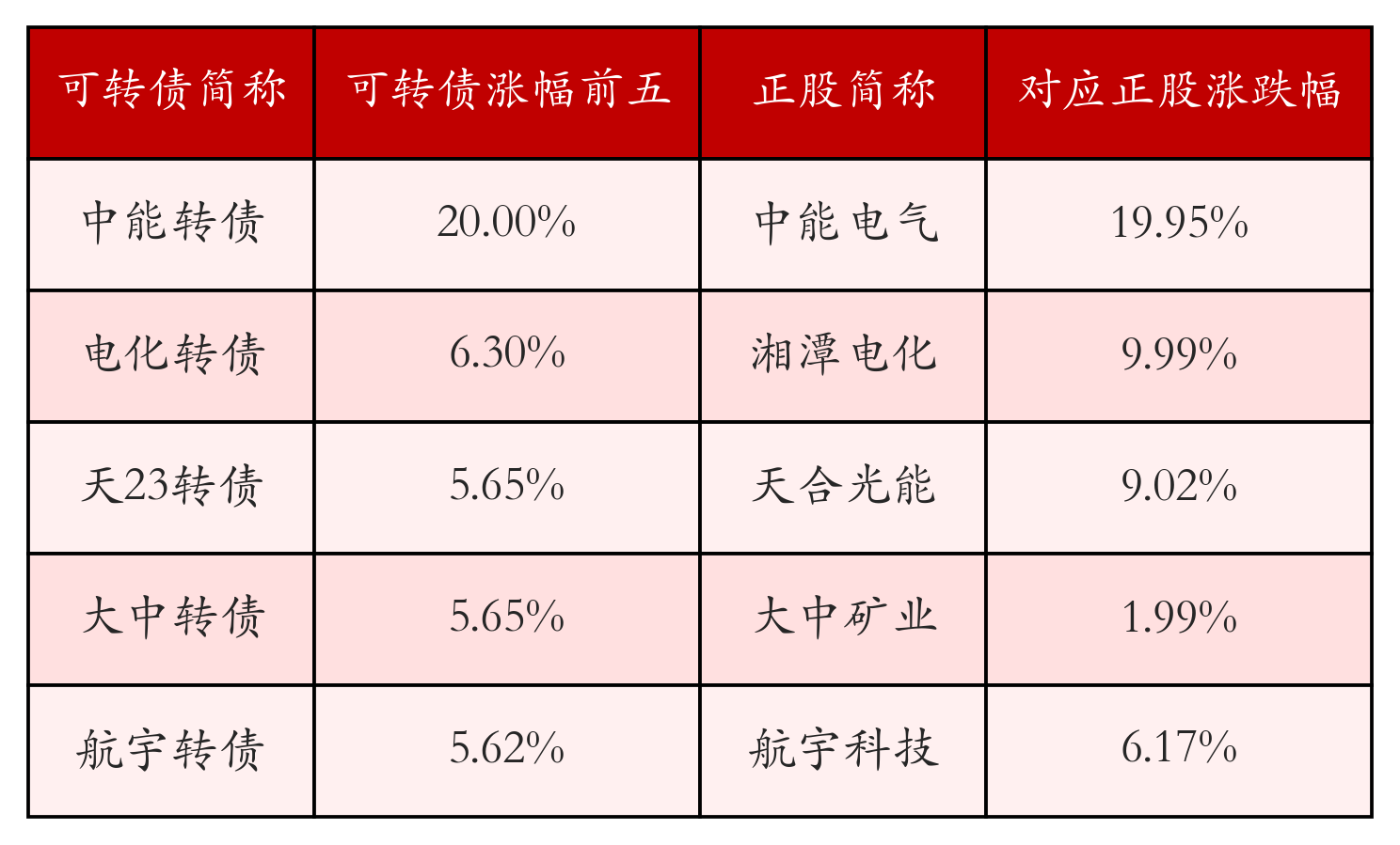 南财智讯11月5日电,南财金融终端盘后数据显示,债市方面,中证转债指数收涨0.74%,报486.21,成交额为695.25亿元。可转债方面,今日共成交401只可转债,其中325只收涨,3只收平,73只收跌。具体来看,30只可转债涨幅超过2%。其中中能转债(123234)涨20.0%,电化转债(127109)涨6.3%,天23转债(118031)涨5.65%。今日有1只可转债跌幅超2%,中旗转债(127081)跌2.81%,信服转债(123210)跌1.74%,新致转债(118021)跌1.38%。存在交易量的可转债所对应的正股中,247只收涨,16只收平,138只收跌。具体来看,16只可转债对应正股涨幅超过5%,其中,中能电气(300062)涨停,收涨19.95%;芯能科技(603105)涨停,收涨10.04%;宏发股份(600885)涨停,收涨10.0%。同时所对应的可转债:中能转债(123234)同涨20.0%;芯能转债(113679)同涨2.45%;宏发转债(110082)同涨4.08%。今日有0只可转债对应正股跌幅超过5%,没有正股跌停。