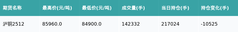 南财智讯11月5日电,南财金融终端盘后期货数据显示,上海期货交易所的沪铜主力合约收跌0.88%,收盘报85670.0元/吨,日内资金流出9.18亿元。其他相关指标见下表: