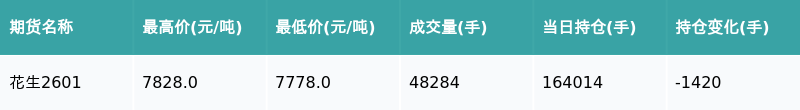 南财智讯11月5日电,南财金融终端盘后期货数据显示,郑州商品交易所的花生主力合约收跌0.1%,收盘报7802.0元/吨,日内资金流出891.32万元。其他相关指标见下表: