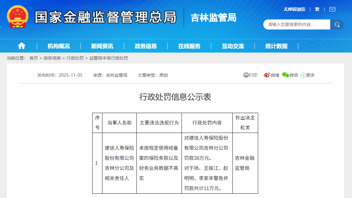 备案条款未依规使用、财务数据失真,建信人寿吉林分公司被罚38万元