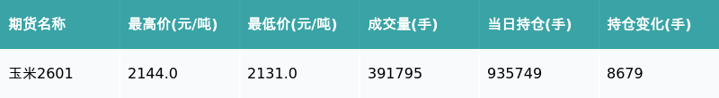 南财智讯11月5日电,南财金融终端盘后期货数据显示,大连商品交易所的玉米主力合约收跌0.23%,收盘报2134.0元/吨,日内资金流入2463.15万元。其他相关指标见下表:
