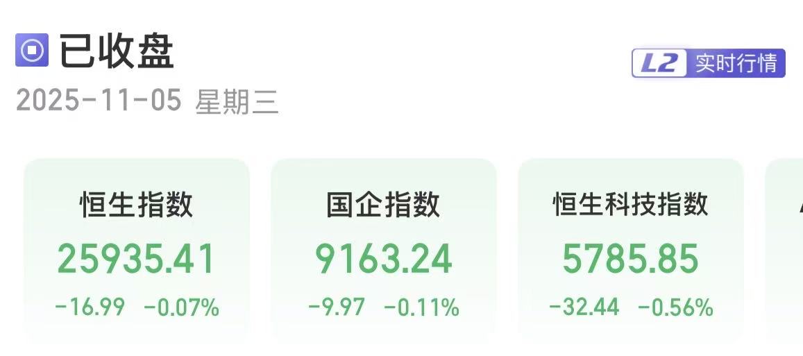 上证报中国证券网讯(刘禹希记者严晓菲)11月5日,港股三大指数表现低迷。截至收盘,恒生指数跌0.07%,报25935.41点;恒生国企指数跌0.11%,报9163.24点;恒生科技指数跌0.56%,报5785.85点。