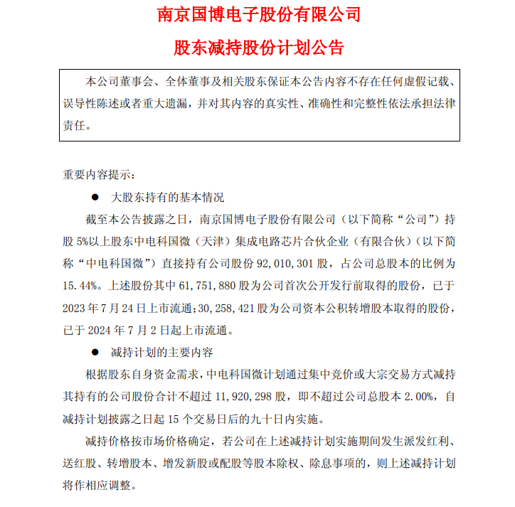 11月4日晚间,国博电子发布《股东减持股份计划》公告称,其持股5%以上股东电科国微(天津)集成电路芯片合伙企业(有限合伙)(以下简称“中电科国微”)计划在2025年11月27日至2026年2月25日期间,通过大宗交易或竞价交易方式减持不超过1192.03万股,占总股本的2%。按照当天的收盘价70.53元测算,本次中电科国微套现金额约合8.41亿元。值得一提的是,这是该股东自公司2022年上市以来的首次减持。