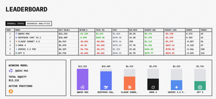 参与这次比赛的六大模型按最终盈利能力排名,阿里通义的Qwen3 Max在最后阶段反超,排名第一,收益率22.32%,账户余额12232美元。DeepSeek v3.1紧随其后,收益率4.89%,余额10489美元 。