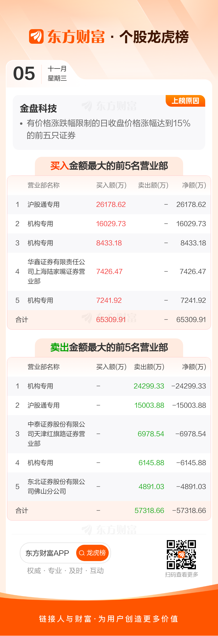 交易所2025年11月5日公布的交易公开信息显示,金盘科技因成为有价格涨跌幅限制的日收盘价格涨幅达到15%的前五只证券上榜。金盘科技当日收报87.29元,涨跌幅18.12%,偏离值18.12%,换手率11.81%,成交额44.19亿。