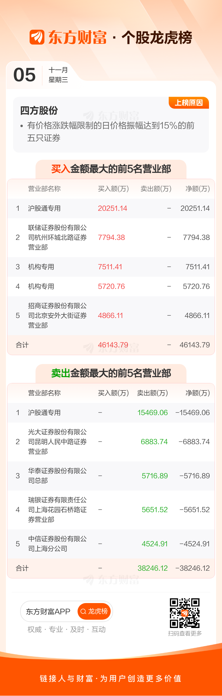 交易所2025年11月5日公布的交易公开信息显示,四方股份因成为有价格涨跌幅限制的日价格振幅达到15%的前五只证券上榜。四方股份当日收报31.19元,涨跌幅8.19%,偏离值16.80%,换手率15.10%,成交额36.70亿。