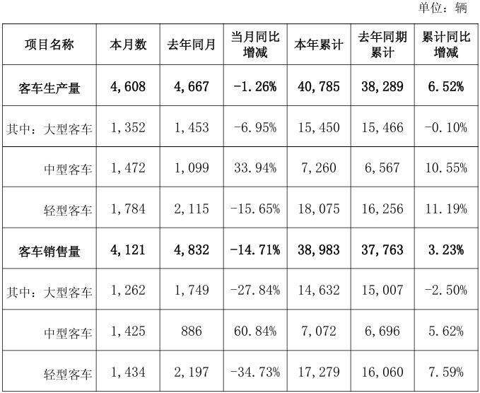 在销售方面,10月份客车销售量为4121辆,同比下降14.71%;累计销售量为3.9万辆,同比增长3.23%。