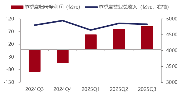 根据中证钢铁指数成分股计算,2025Q3钢铁板块实现营收4834亿元,基本与Q2持平;实现归母净利润90亿元,环比增长11%,自2024Q4起连续4个季度环比上行,同比扭亏为盈。