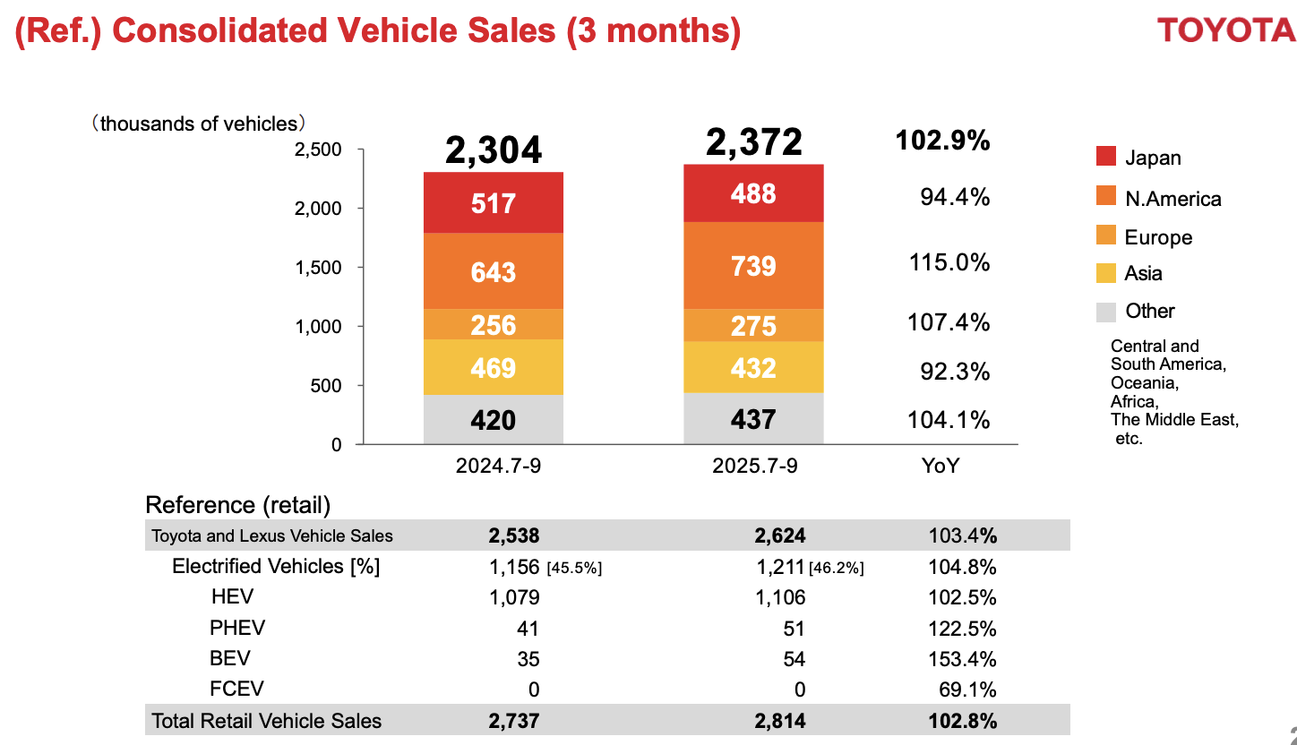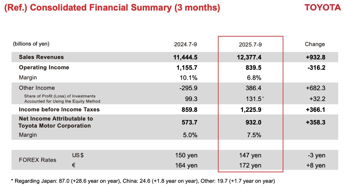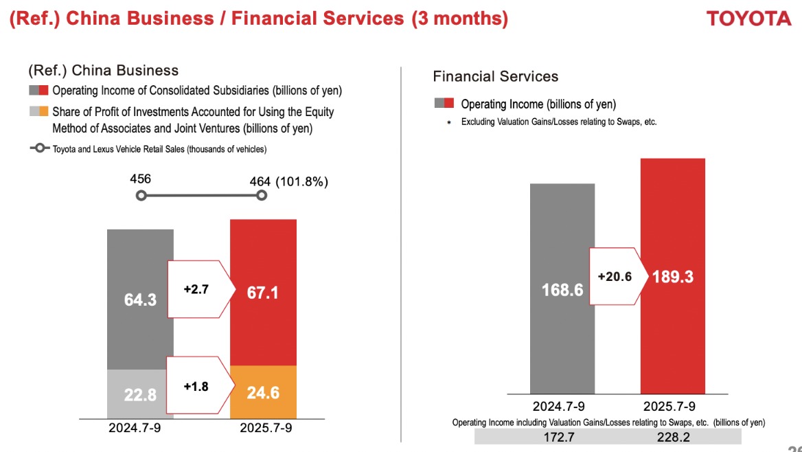 丰田汽车也在财报中详细介绍了中国业务板块的相关情况,2025年7-9月丰田及雷克萨斯品牌在华零售销量达46.4万辆,同比增长1.8%,2024年同期为45.6万辆,中国市场终端需求保持温和扩张。合并子公司营业利润为671亿日元,较去年同期的643亿日元增长28亿日元,反映出在华合资企业(如一汽丰田、广汽丰田)的经营效率有所提升。