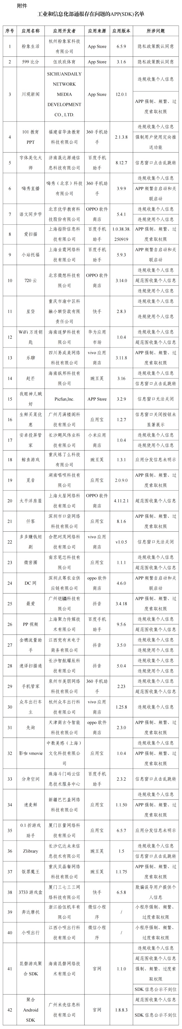 通报:工信部通报!这42款APP及SDK存在侵害用户权益行为