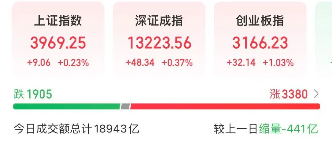 今天,A股反弹。截至收盘,上证指数上涨0.23%,深证成指上涨0.37%,创业板指上涨1.03%。市场全天成交额18943亿元,较上日缩量441亿元。全市场超3300只个股上涨。