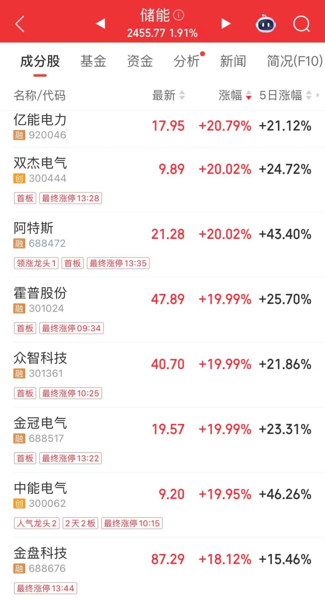 午后,储能板块率先走强,通润装备在下午开盘后不到两分钟就直线拉升涨停,阿特斯“20CM”涨停。阳光电源涨超7%,成交额为233.73亿元,为A股成交额唯一超200亿元的个股。