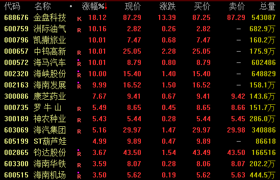 海南自贸概念今日再度活跃,截至收盘,洲际油气、凯撒旅业、海峡股份、海南发展等涨停,海马汽车斩获4连板,康芝药业涨近8%。