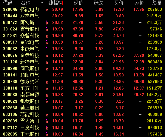 储能、风电、光伏等新能源概念盘中集体走高,截至收盘,亿能电力涨超20%,双杰电气、阿特斯、众智科技、金冠电气、中能电气等20%涨停,金盘科技涨超18%续创历史新高。此外,西典新能、三变科技、特变电工等午后均涨停;市值超4000亿元的阳光电源涨超7%,全日成交233.7亿元,位居A股成交额首位。