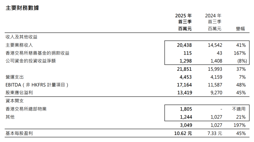 11月5日午间,香港交易所发布2025年三季报。财报显示,香港交易所前三季度收入及溢利均创历史新高。其中,2025年前三季度收入及其他收益为218.51亿元(港元,下同),较2024年同期上升37%;股东应占溢利为134.19亿元,较2024年同期上升45%。