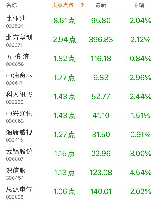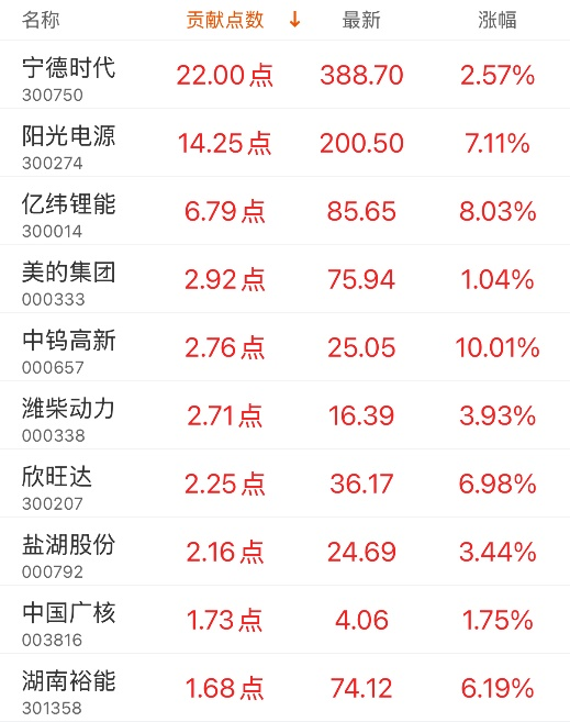 对深证成指贡献点数最多的个股是宁德时代,贡献22点,该股当日涨2.57%,收盘价388.7元;拖累点数最多的个股是比亚迪,拖累8.61点,该股当日跌2.04%,收盘价95.8元。