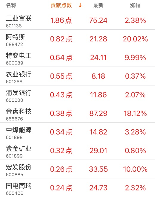 对上证指数贡献点数最多的个股是工业富联,贡献1.86点,该股当日涨2.38%,收盘价75.24元;拖累点数最多的个股是建设银行,拖累0.95点,该股当日跌0.73%,收盘价9.48元。