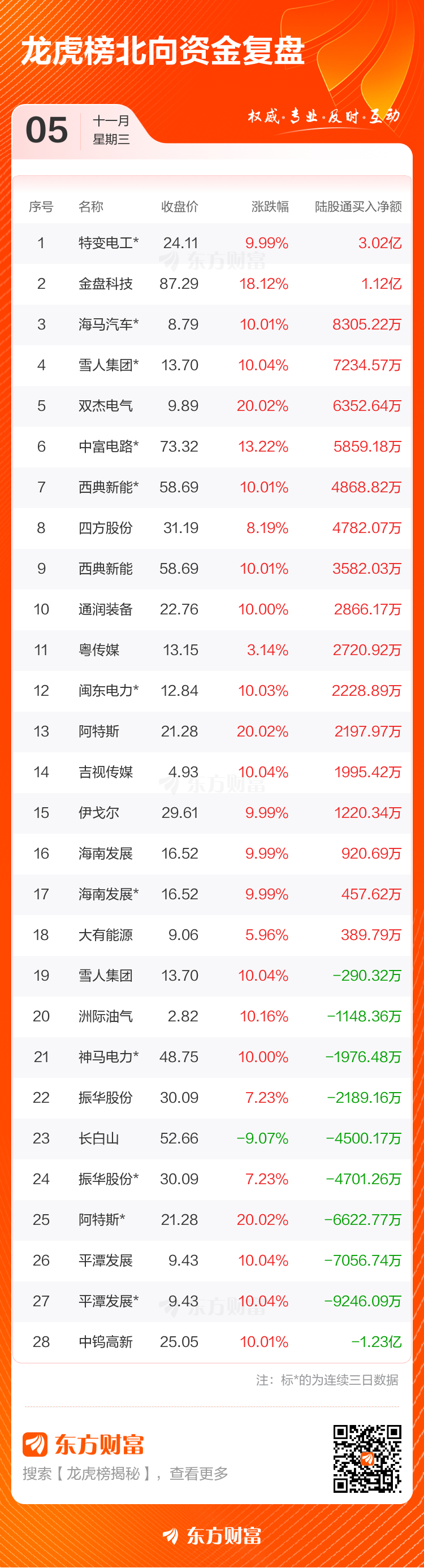 11月5日龙虎榜复盘:“中山东路”5.41亿元净买入特变电工