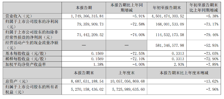 与此同时,公司的经营现金流也出现大幅恶化。前三季度经营活动产生的现金流量净额5.81亿元,同比锐减52.95%,反映出企业通过日常经营获取现金的能力显著减弱,资金链压力逐步显现。从资产规模来看,本报告期末总资产86.88亿元,较上年度末的100.57亿元下降13.62%;归属于上市公司股东的所有者权益52.70亿元,较上年度末的57.26亿元下降7.96%,资产实力有所削弱。