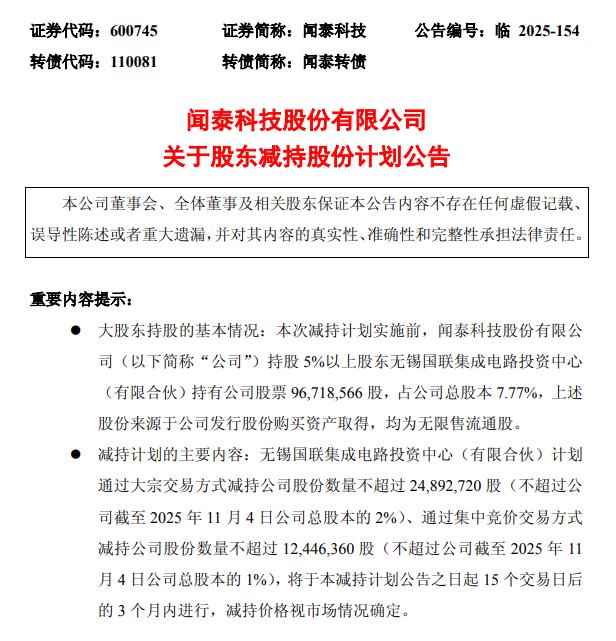 闻泰科技:股东无锡国联集成电路投资中心拟减持不超3%公司股份