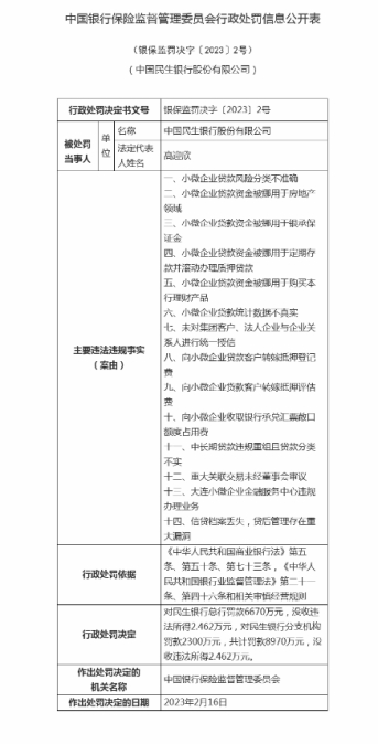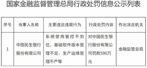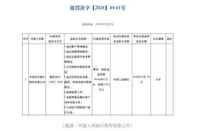 近日,国家金融监督管理总局对民生银行(600016.SH)开出罚单,以其存在贷款、票据、同业等核心业务管理不审慎,以及监管数据报送不合规等违法违规行为,对该行处以5865万元罚款。