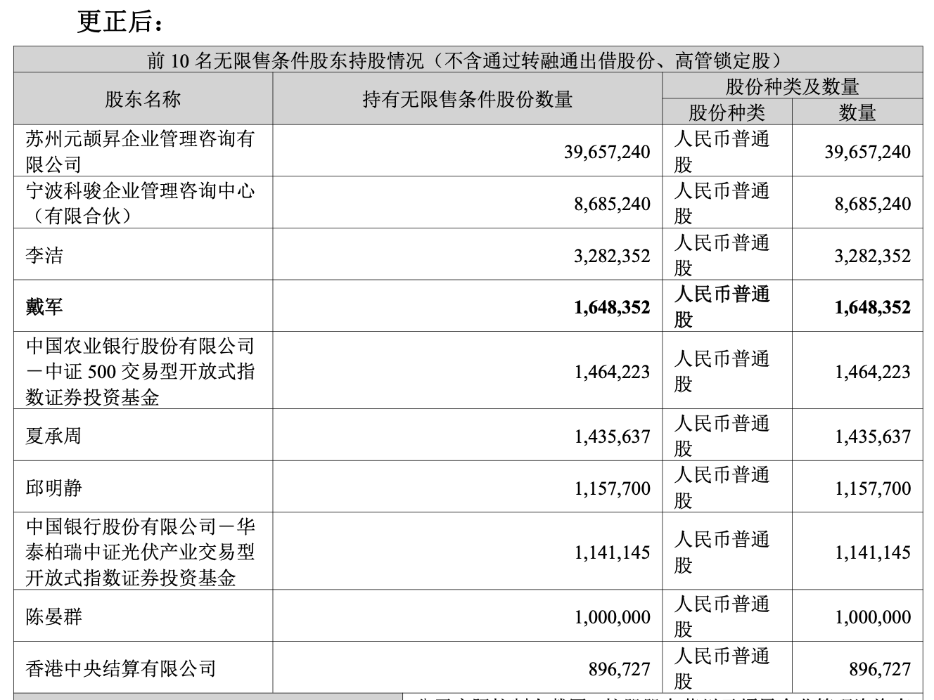 对比更正前后,前10名无限售条件股东持股情况中,罗博特科漏写了戴军的持股情况。