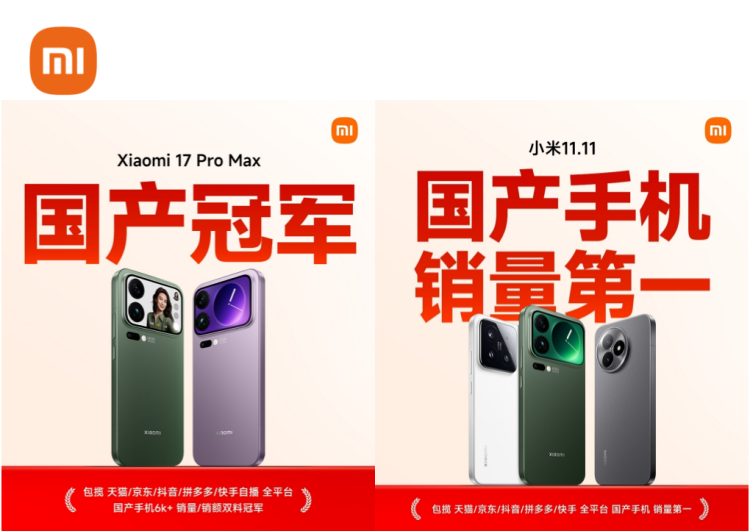 值得关注的是,小米手机一举斩获国产手机销量冠军,包揽天猫、京东、抖音、拼多多、快手全平台国产手机销量第一。旗下高端旗舰小米17 Pro Max销售势头强劲,包揽天猫、京东、抖音、拼多多、快手自播全平台国产手机“6K+”价位段销量、销售额双料冠军。