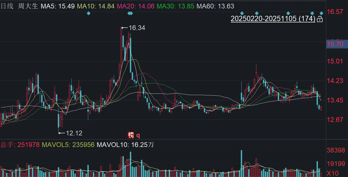 二级市场上,截至11月5日收盘,周大生上涨0.69%报13.17元/股,总市值约142.96亿元,今年来公司股价累计下跌约5%。