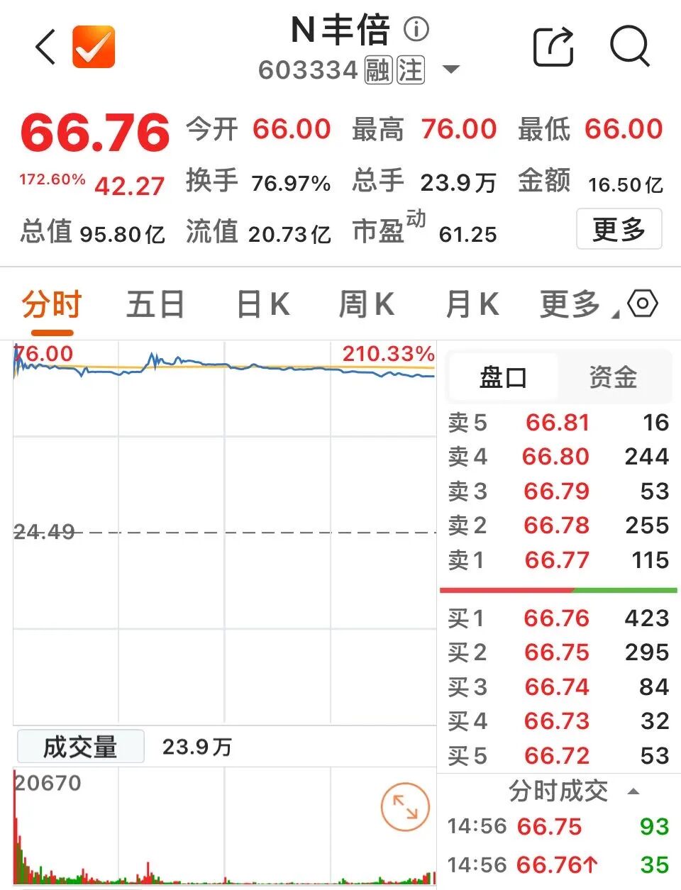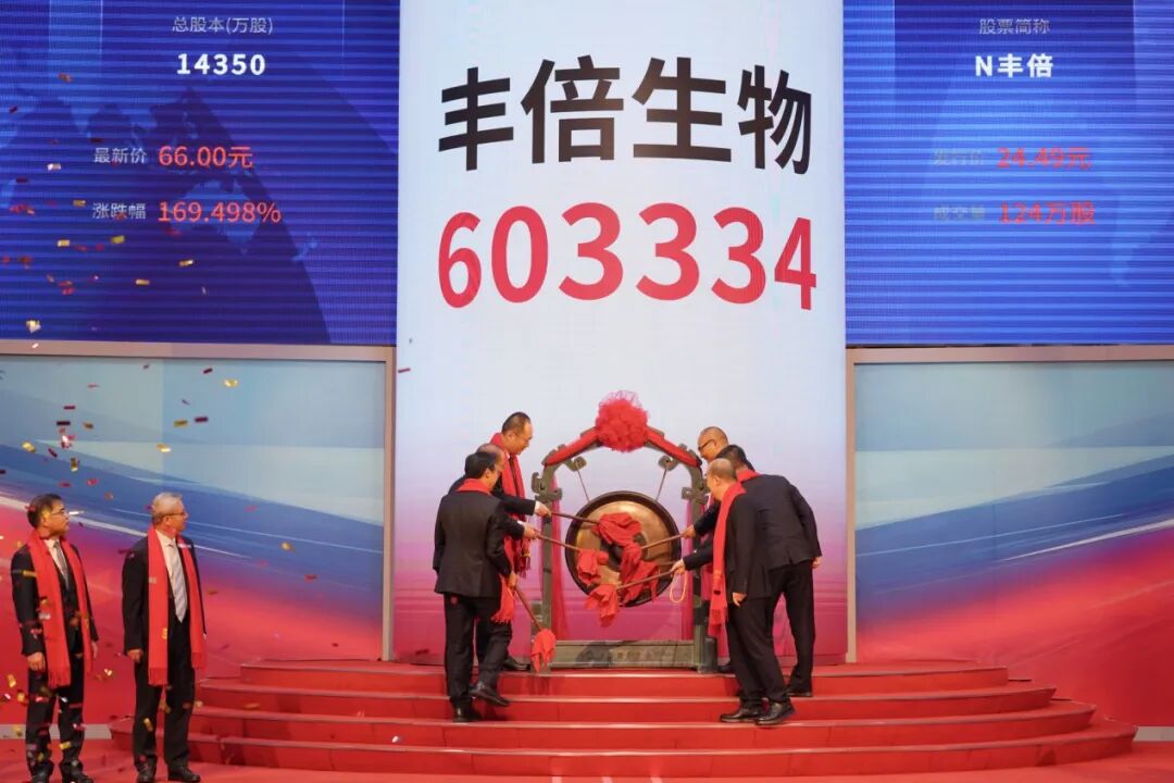 上市首日,丰倍生物开盘报66.00元/股,较发行价上涨169.50%;盘中最高触及76.00元/股,上涨210.33%;收盘报66.76元/股,上涨172.60%。公司最新总市值95.80亿元。