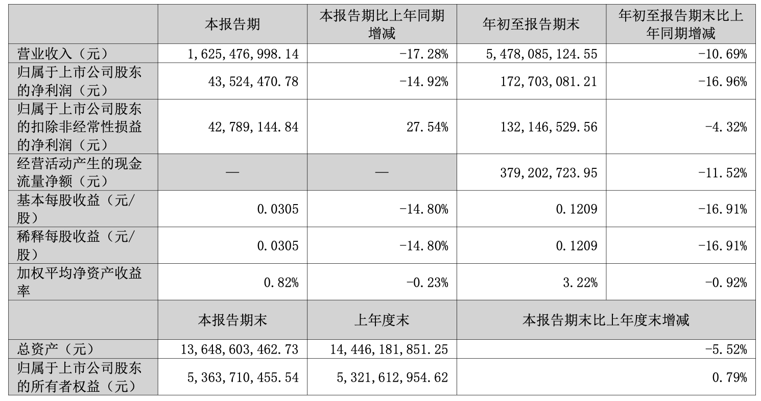 今年前三季度,公司实现营业总收入54.78亿元,同比下降10.69%;归母净利润1.73亿元,同比下降16.96%;扣非净利润1.32亿元,同比下降4.32%;经营活动产生的现金流量净额为3.79亿元,同比下降11.52%。