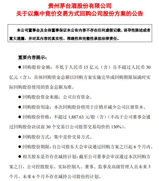 贵州茅台:拟以15亿至30亿元回购股份并注销
